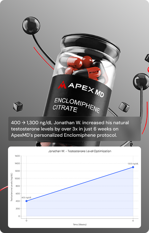 The results speak for themselves. Jonathan W. came to ApexMD with testosterone levels sitting at 400 ng/dL. Within 6 weeks on a personalized Enclomiphene protocol, his levels climbed to 1,300 ng/dL — more than 3x where he started. That’s the difference a medically-guided, data-driven approach makes.